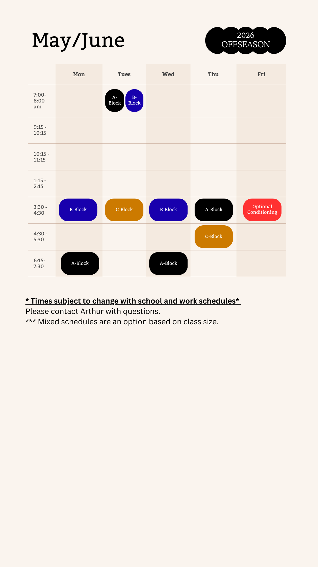 We try to find times that work for most. For those who can’t make a certain time, there are opinions for mix and matching times, or online training.