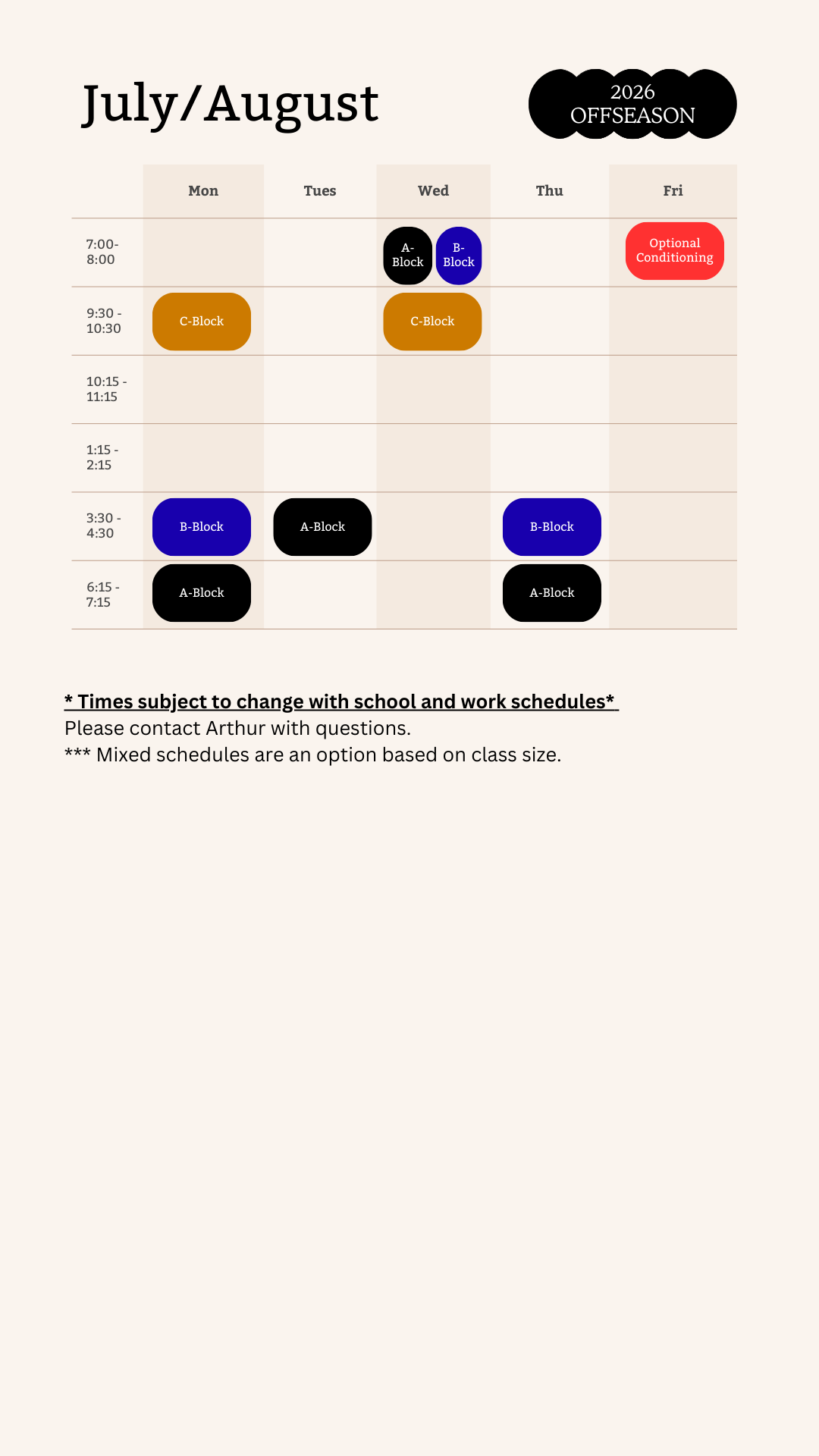 Includes 4 training days/week + FREE optional conditioning day + Physical Testing + Offseason Shirt.